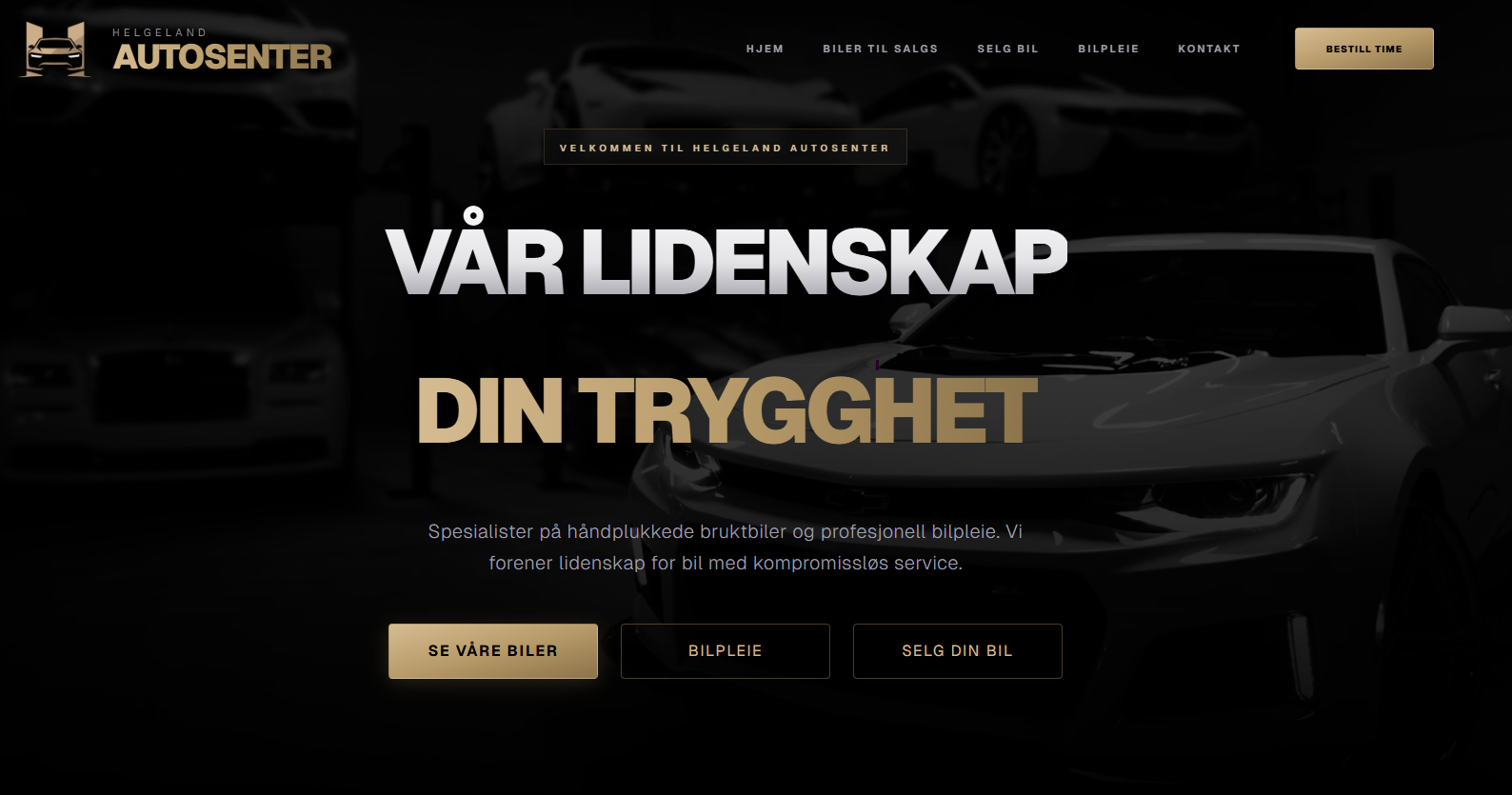 Nettside for en bruktbilforhandler med annonser, salgsskjema, info om detailing-tjenester osv.